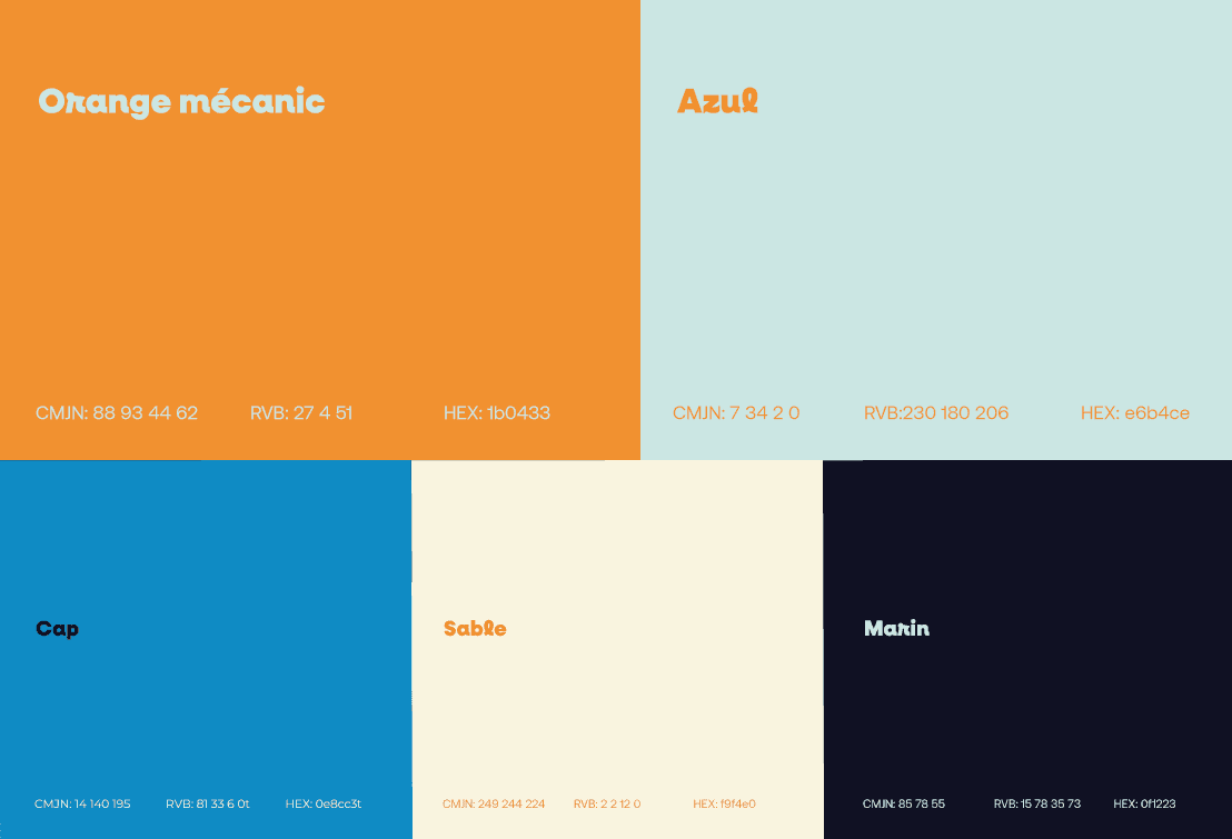 La palette colorielle mêle un orange mécanique vibrant à des nuances plus douces — azul, sable, cap, marin — créant un univers contrasté mais harmonieux. Elle évoque autant l’énergie du soleil et du vent que la fraîcheur de l’eau et des grands espaces. Cet équilibre chromatique traduit l’ambition de FLO\W : rendre le voyage durable désirable, accessible et inspirant.