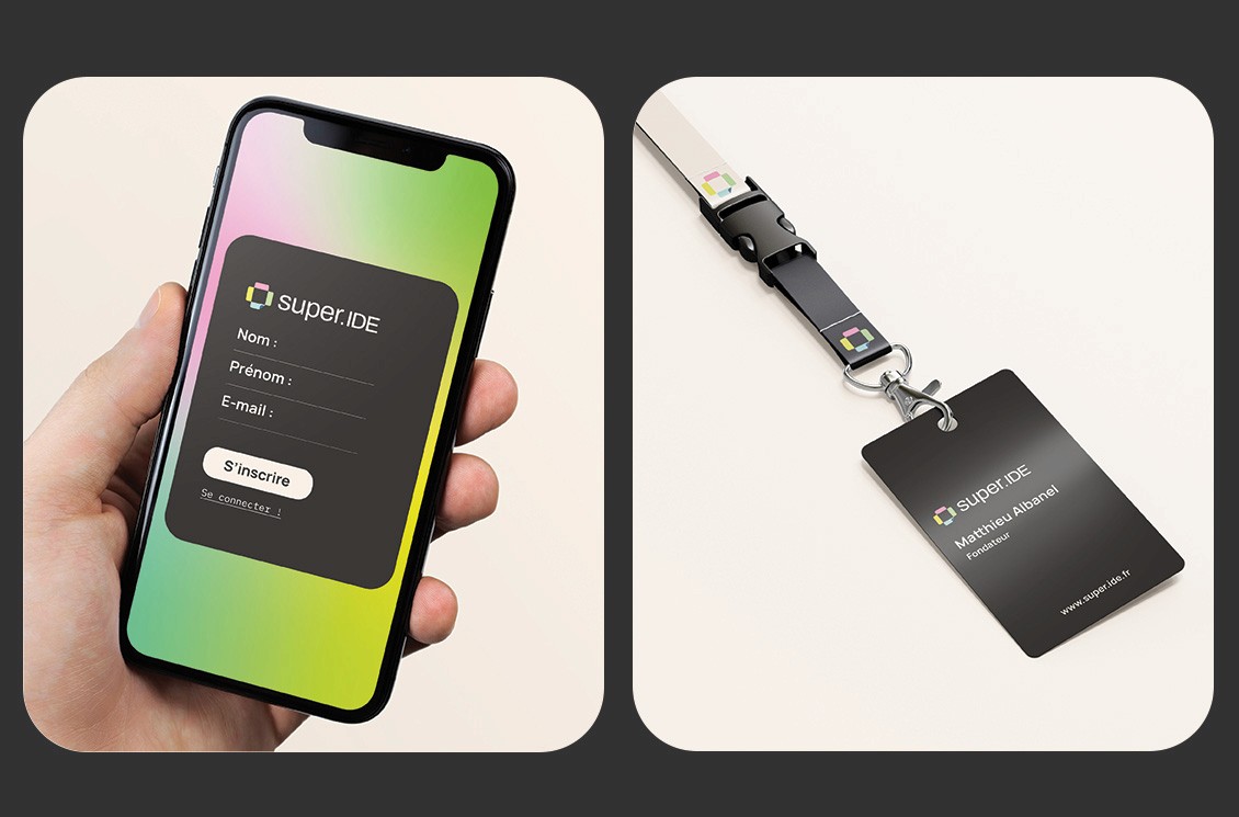 Pensée comme un véritable compagnon d’apprentissage, Super.IDE accompagne chaque utilisateur, des premières révisions jusqu’à la pratique professionnelle. Son identité visuelle traduit cette ambition : rendre l’apprentissage fluide, lisible et engageant à chaque étape. Le logo, une croix médicale construite à partir de fiches bristol, incarne cette approche pédagogique : chaque fiche représente une unité de savoir, et les couleurs choisies sont reprises dans toute la palette graphique pour créer un univers cohérent et structuré.
